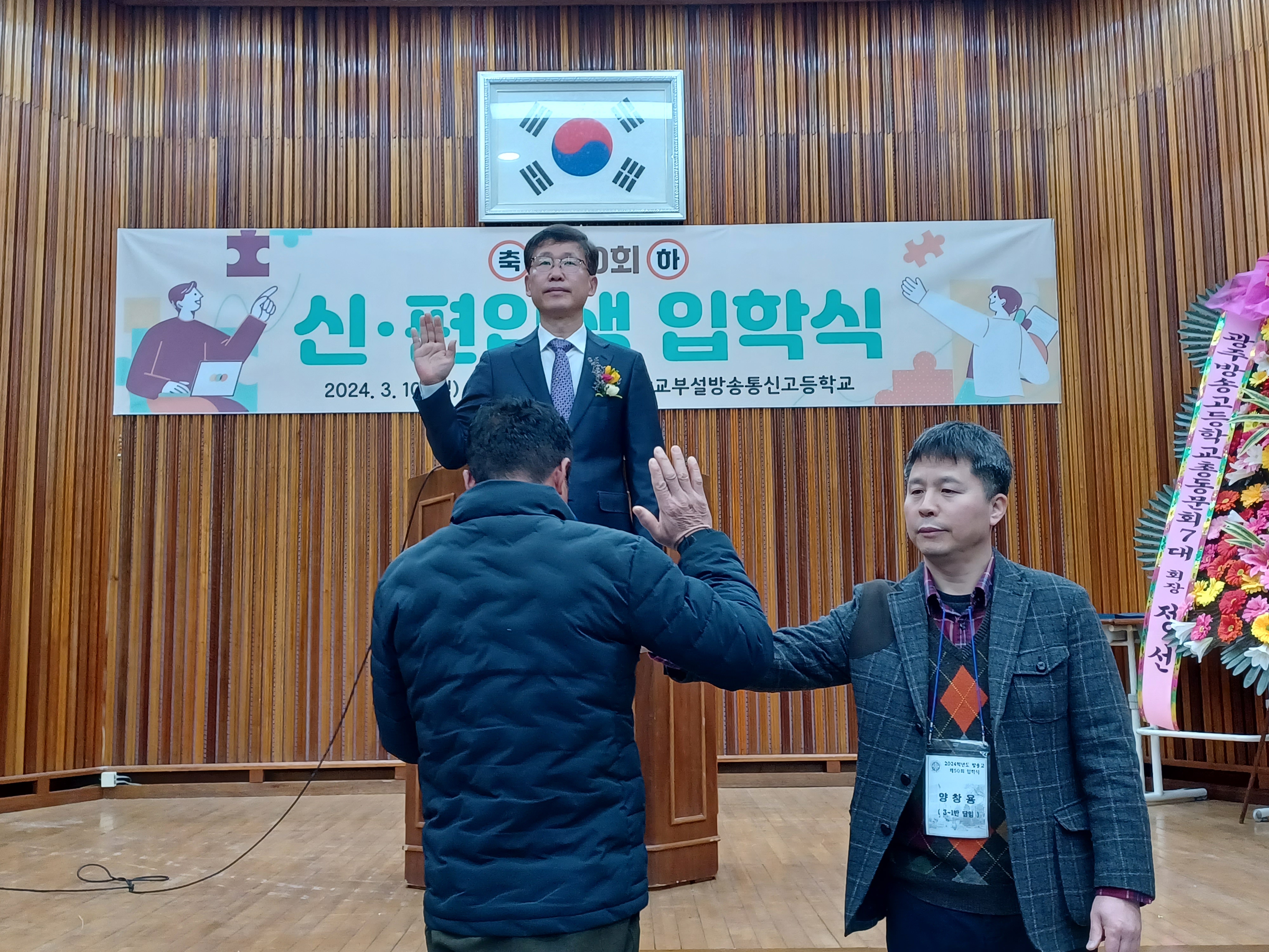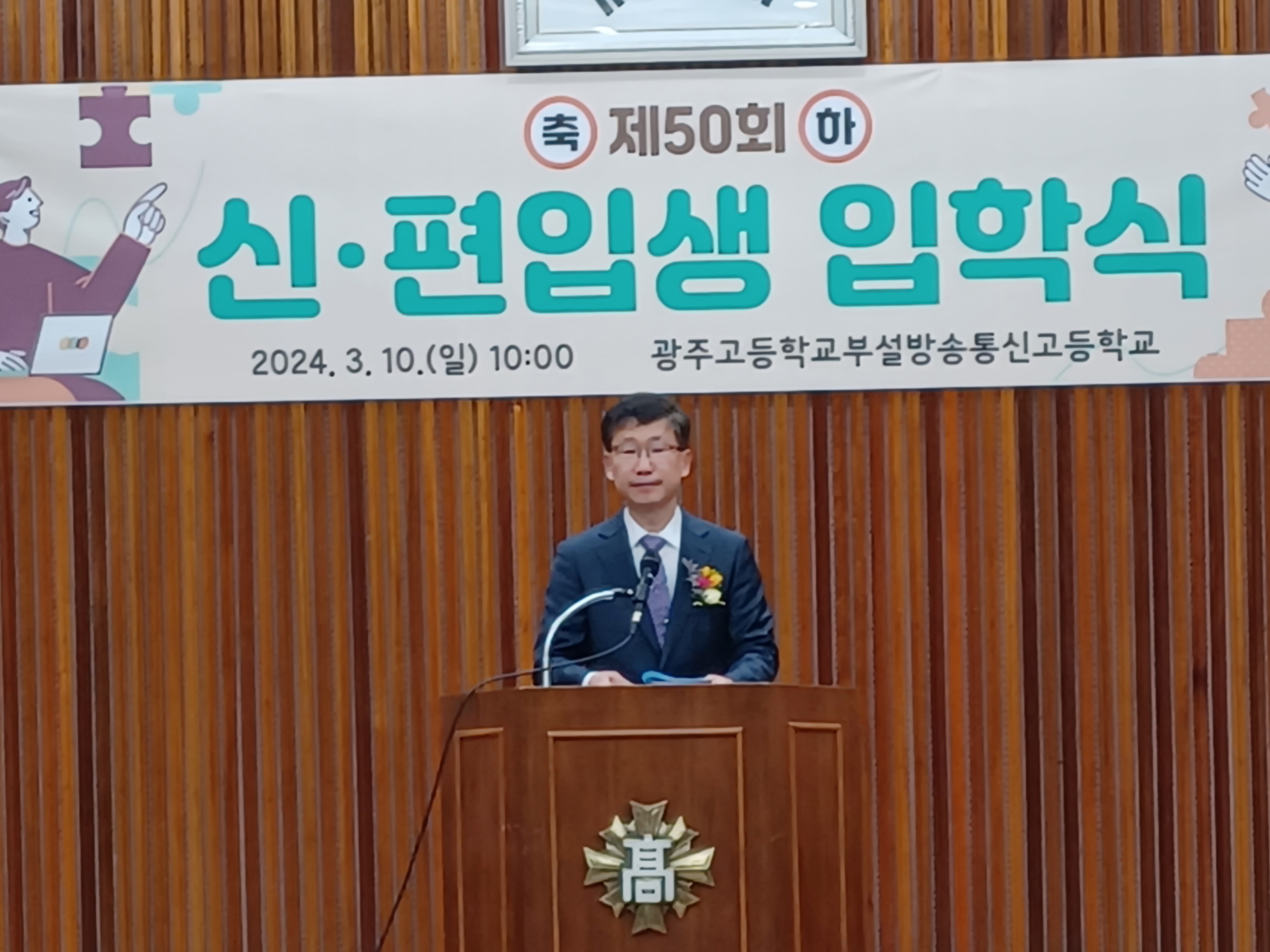 광주 고등학교(진정준 교장) 부설 방송통신고등학교가 3월 10일 내외 귀빈과 방송통신고 교사. 학생이 참석한 가운데 본교 진로 관 시청각실에서 2024년도 제50회 신입생 입학식을 하였다.
